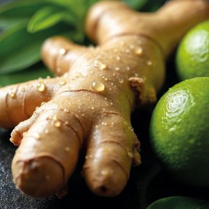 Raw ginger root and whole limes sit on a dark wet surface. Green leaves are in background. Ginger and citrus are fresh ingredients for cooking and healthy drinks.
